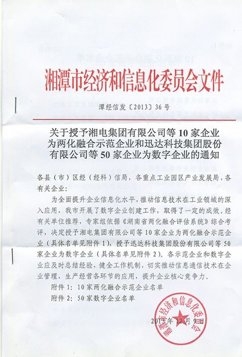 公司在湘潭經(jīng)濟和信息委員會數(shù)字企業(yè)創(chuàng)建評審中,榮獲50家數(shù)字企業(yè)稱號。標(biāo)志著我司信息化數(shù)字化建設(shè)工作得到政府部門的支持和認(rèn)可,預(yù)示著公司管理向科學(xué)化、信息化方向穩(wěn)步提升。